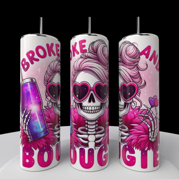 The Kinda Boujee But Broke 20oz Tumbler by Kreative Kreationz features a cartoon skeleton with pink sunglasses and a fur coat holding a sparkly cup, plus bold "Broke and Bougie" text on a glittery pink background—perfect for Halloween!.