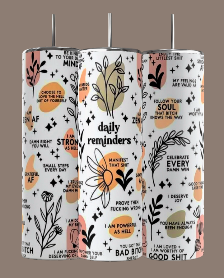 The Kreative Kreationz "Daily Reminders" 20oz Skinny Tumbler features three sublimated designs with motivational quotes and abstract florals. The white background with black, orange, and pink graphics presents positive affirmations, while double-wall insulation keeps drinks at the perfect temperature.