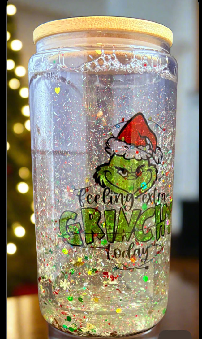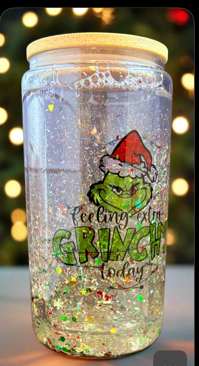 Our 16oz Grinch glass snow globe tumbler “Feeling Extra Grinchy Today” is made of green and red glitter with a double glass to separate your drink and the mixed glitter! Bamboo lid with reusable straw