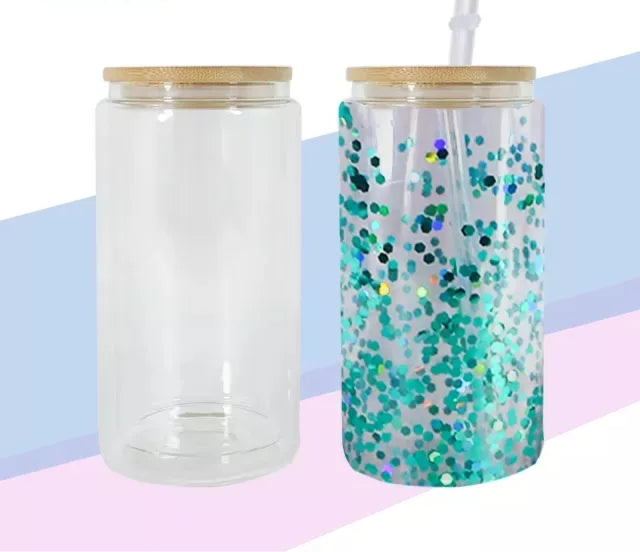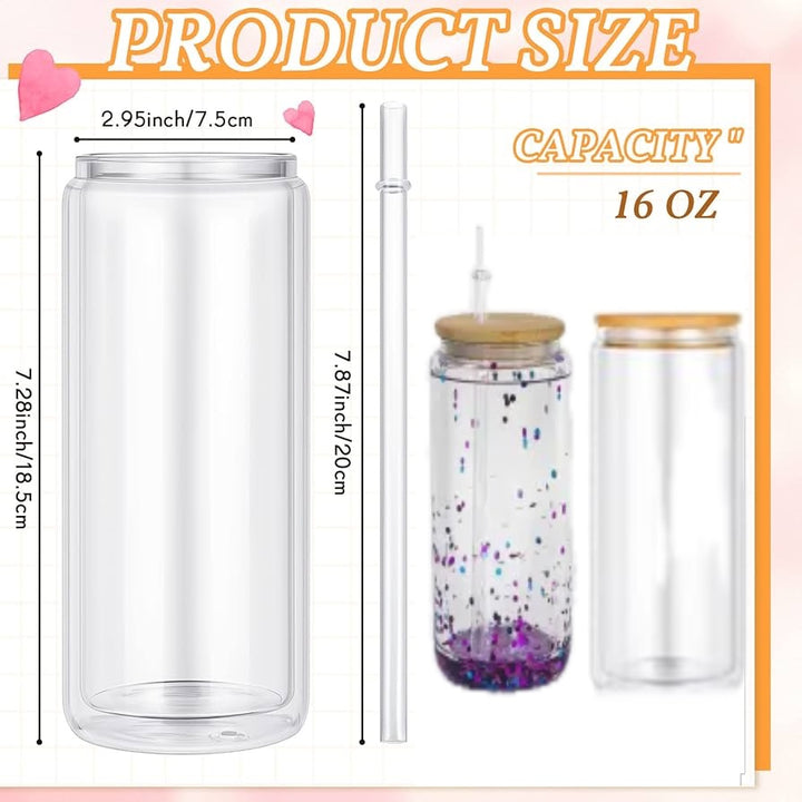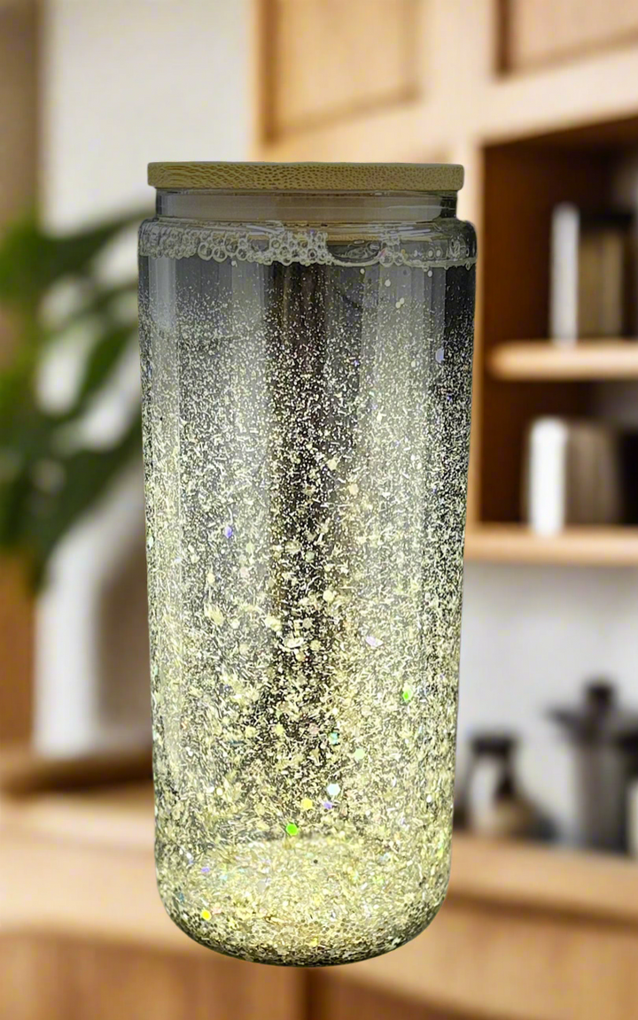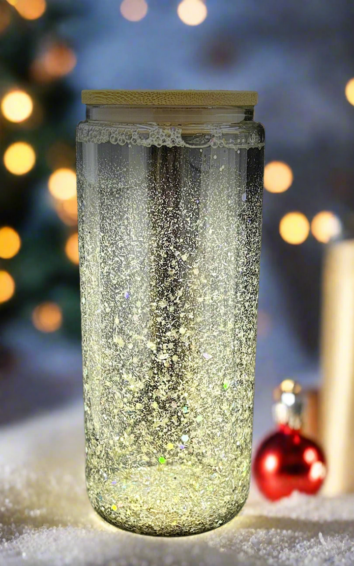 Our customizable 16oz glass snow-globe tumbler is made of glitter with a double glass to separate your drink and the mixed glitter! Bamboo lid with reusable straw