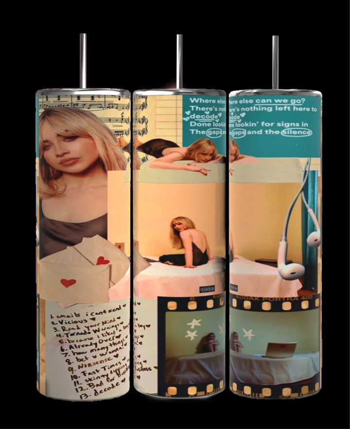 Sabrina carpenter tumbler with black background on a white platform rotating in a circle motion counter clockwise showing 360 angle of the wrapped tumbler design