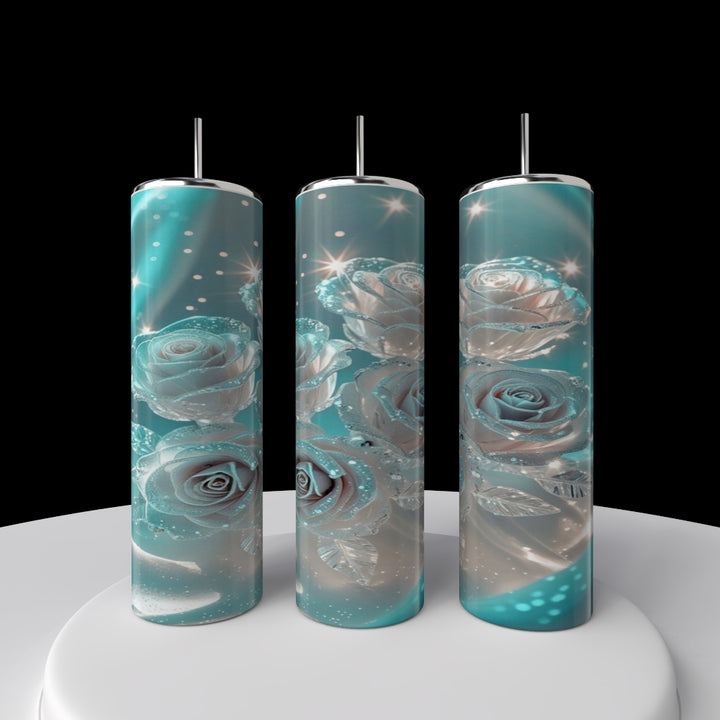 Three Kreative Kreationz Glowing Roses 20oz Stainless Steel Tumblers with straws, featuring glowing blue and silver roses and leaves, stand on a wooden surface in a softly blurred kitchen setting.