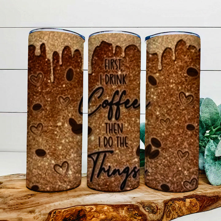 Three Kreative Kreationz “First I drink coffee then I do the things” 20oz tumblers with a coffee-themed design add stylish charm to your kitchen counter.
