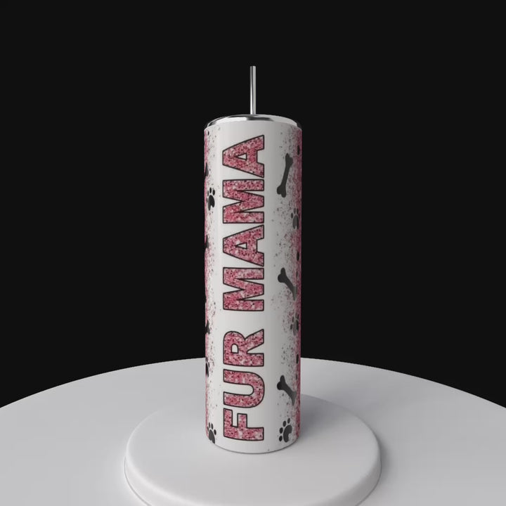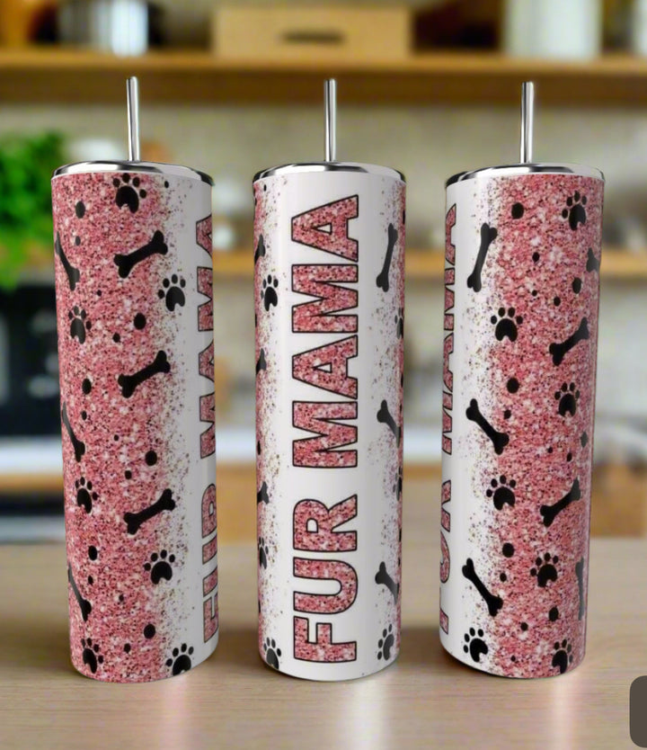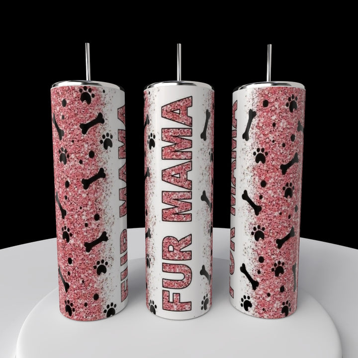 Three Kreative Kreationz Dog Mom 20oz Tumblers with white lids sit on a counter, featuring a pink glitter background, black dog bones and paw prints, and “FUR MAMA” vertically on the center customizable tumbler.