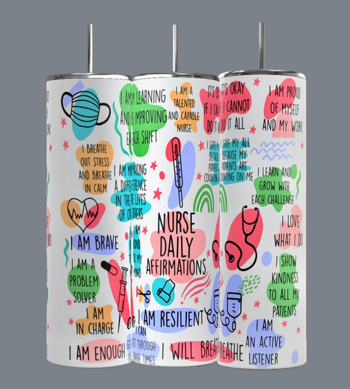 Kreative Kreationz’s Nurse Affirmation 20oz Skinny Tumbler features vibrant nurse-themed designs and daily affirmations like "I am brave," "I am resilient," and "I am enough"—perfect motivational drinkware for medical professionals.