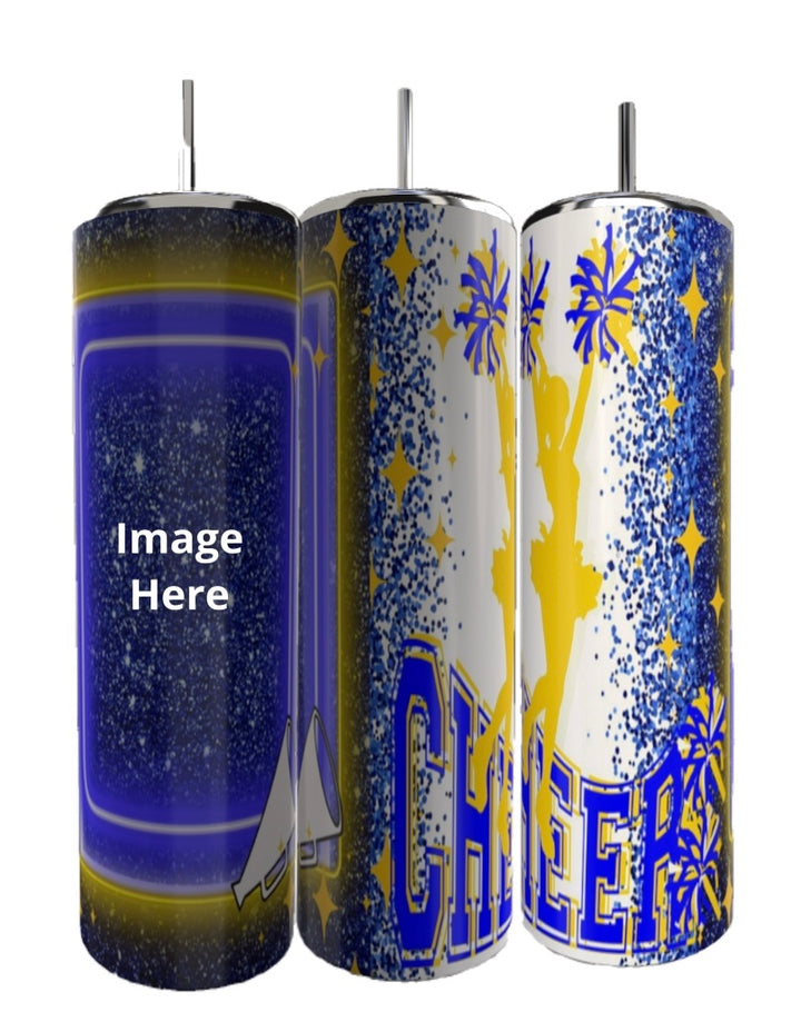 Three Kreative Kreationz Cheer 20oz Tumblers are outdoors: one customizable with "Image Here" and two featuring blue and yellow cheerleading designs, pom-poms, stars, and "CHEER" on durable stainless steel.