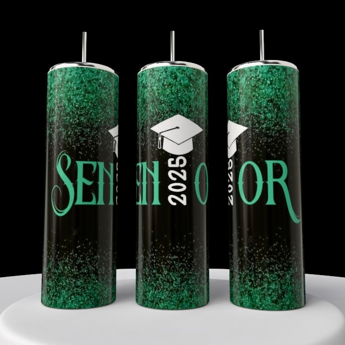 Three Kreative Kreationz 2025 Senior Graduate 20oz tumblers in green and black with a glittery luxury design, "SENIOR" text, a white graduation cap, and "2025" printed vertically are displayed on a wooden surface.