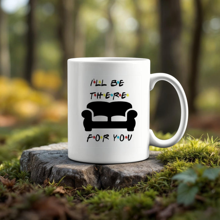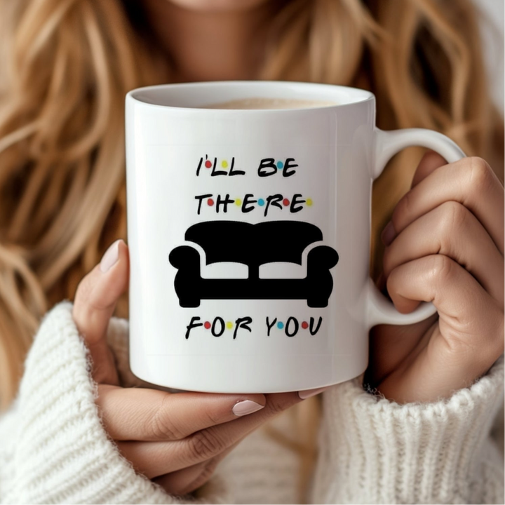 A woman with long, wavy hair holds a Kreative Kreationz Friends Couch Mug, a white ceramic piece decorated with "I'll be there for you" above an illustration of a black couch. She is dressed in a cozy white sweater.
