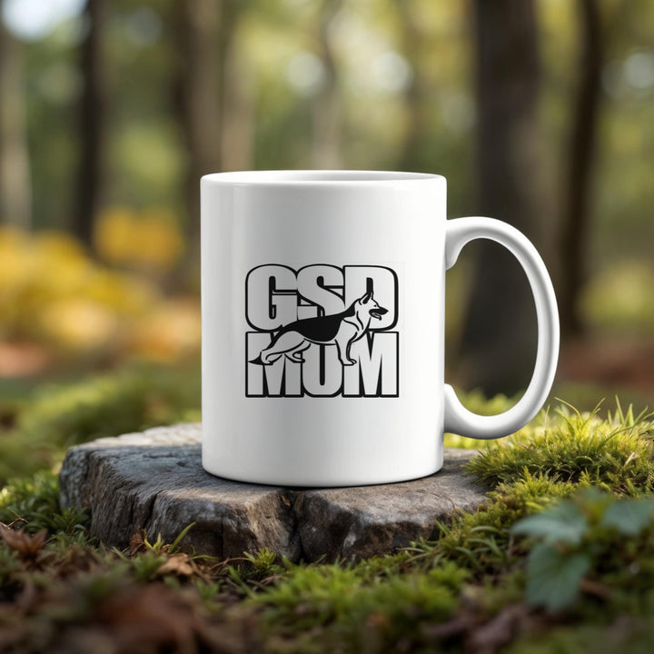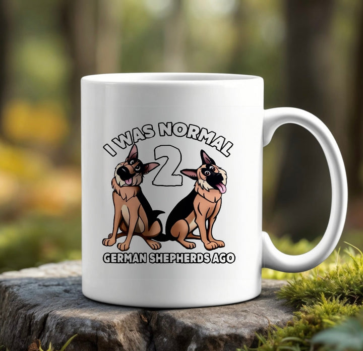 A white ceramic mug from Kreative Kreationz sits on a wooden table amid festive Christmas decor. Featuring two cartoon German Shepherds and the text, "I WAS NORMAL 2 GERMAN SHEPHERDS AGO," this German Shepherd Ceramic Mug captures a playful custom spirit.