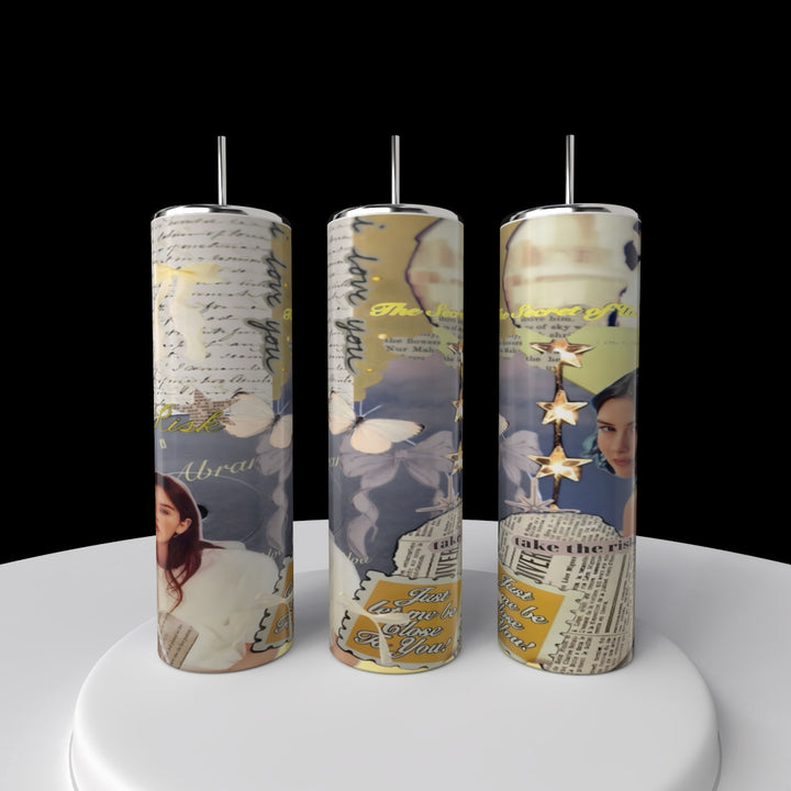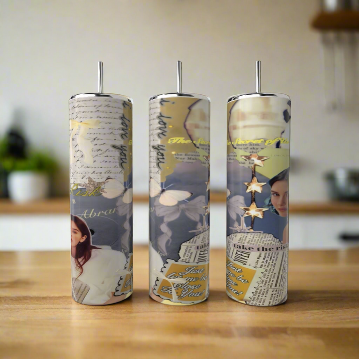 Three tall Gracie Abrams 20oz Skinny Tumblers by Kreative Kreationz, featuring blue collage-style designs with butterflies, handwritten notes, a woman’s face, gold stars, and inspirational text, stand on a kitchen counter.