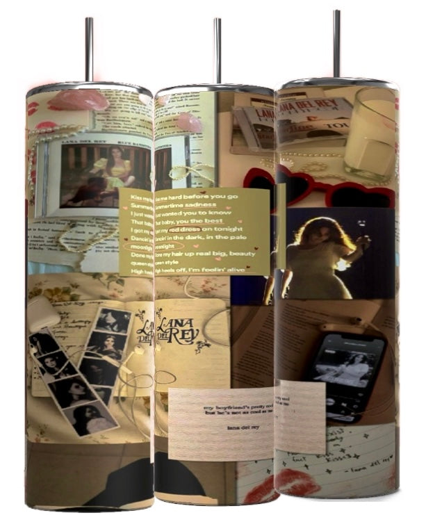 The Lana Del RayTumbler by Kreative Kreationz is a set of three tall stainless steel tumblers featuring nostalgic collages of vintage photos, handwritten notes, film strips, song lyrics, and retro memorabilia in warm tones.