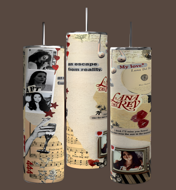 Set of three Kreative Kreationz Lana Del RayTumbler cups featuring her photos, lyrics, red hearts, music notes, and vintage designs on black. These reusable tumblers are perfect for fans and eco-conscious users.