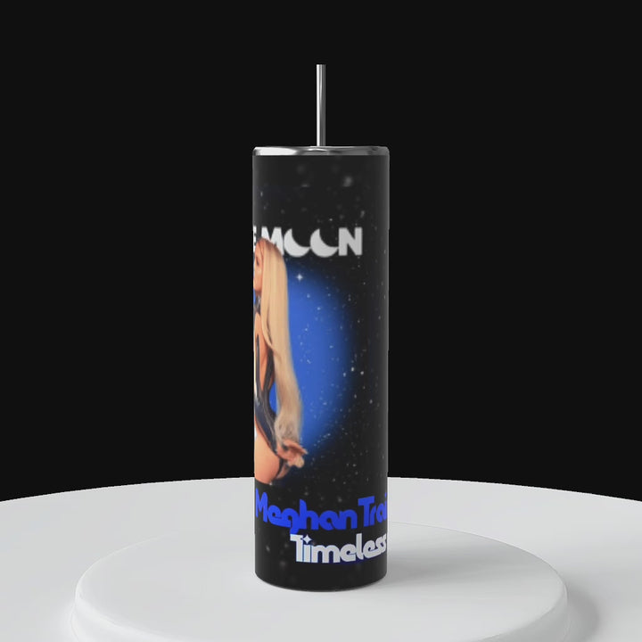 Kreative Kreationz's "Meghan Trainor | To The Moon" 20oz Skinny Tumbler features a space-themed design with a long-haired person in a blue and black outfit. The text reads “To the Moon” and “Meghan Trainor Timeless.” Each tumbler includes a spill-proof lid for secure drinks.