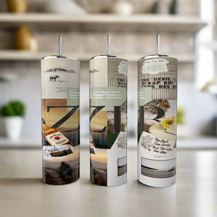 Three Kreative Kreationz Zach Bryan 20oz tumblers with metal straws feature collage-style designs of text, nature, and abstract patterns. These eco-friendly, reusable stainless steel tumblers are displayed against a blurred indoor backdrop.