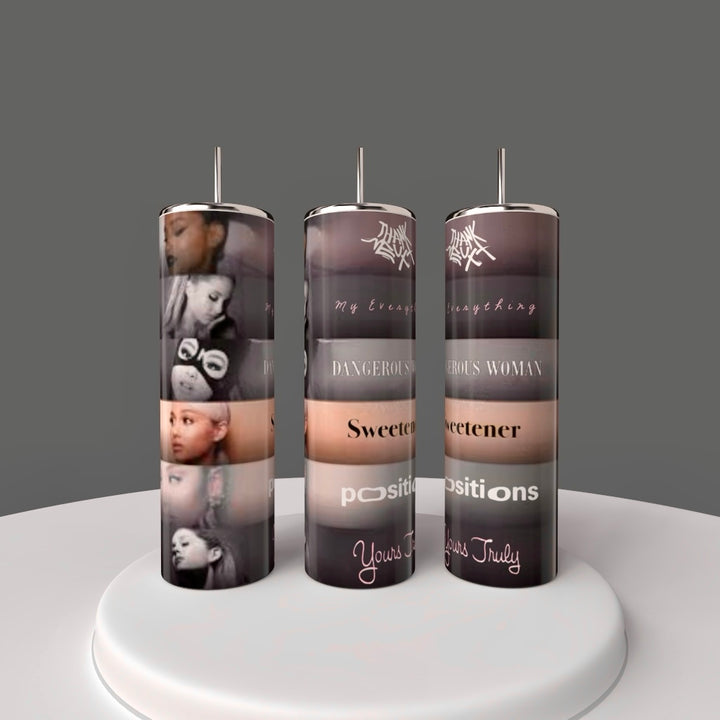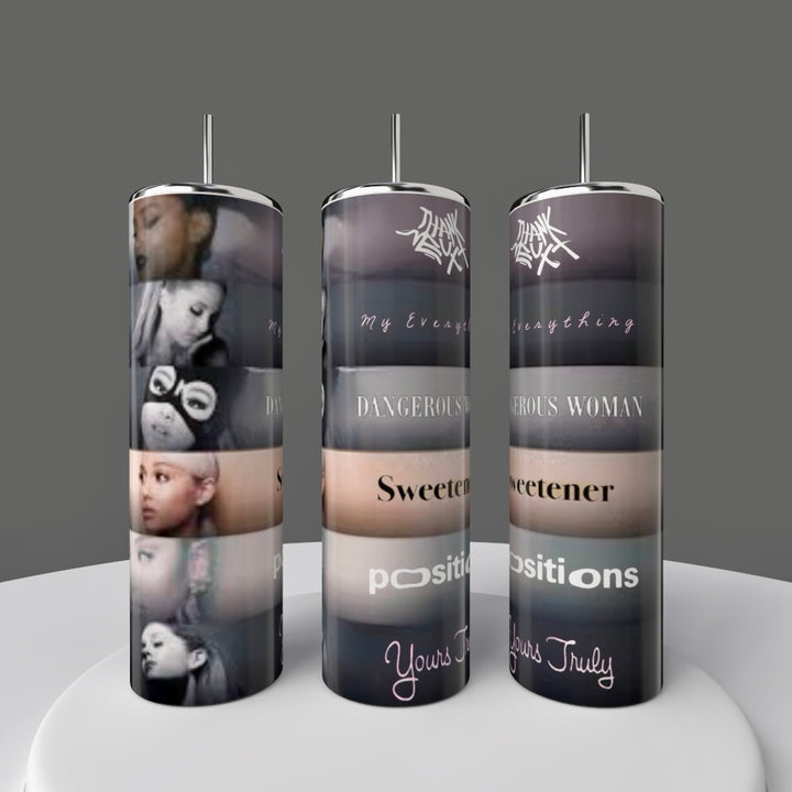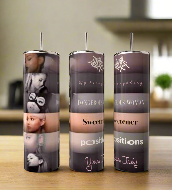 Three tall candles featuring Ariana Grande album art and song titles sit on a wooden surface beside the "Ariana Grande Album Aesthetic with External Sunshine 20oz Tumbler" by Kreative Kreationz in a modern kitchen with blurred shelves in the background.