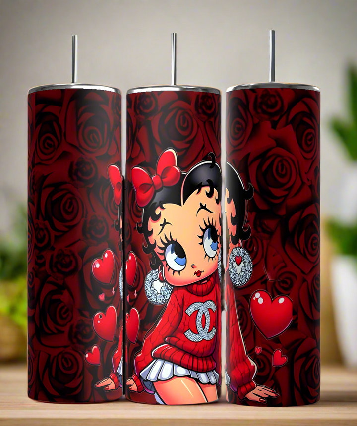 Three decorative candles depict a cartoon character with large eyes and a red outfit, reminiscent of the Betty B 20oz Skinny Tumbler by Kreative Kreationz, surrounded by rose patterns and heart motifs on a rich red background with black rose designs.