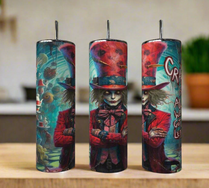 Three 20oz Crazy People Tumblers by Kreative Kreationz, featuring vibrant art of a whimsical character in a red hat and coat, are shown on a kitchen counter with plants and blurred shelves in the background.