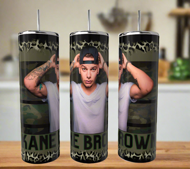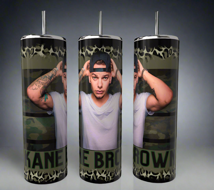 The Kane Brown 20oz Tumblers by Kreative Kreationz showcase a camo pattern with an image of a person in a white shirt and backward cap, hands near head. Kane Brown's name is elegantly displayed at the bottom, adding style to these unique tumblers.