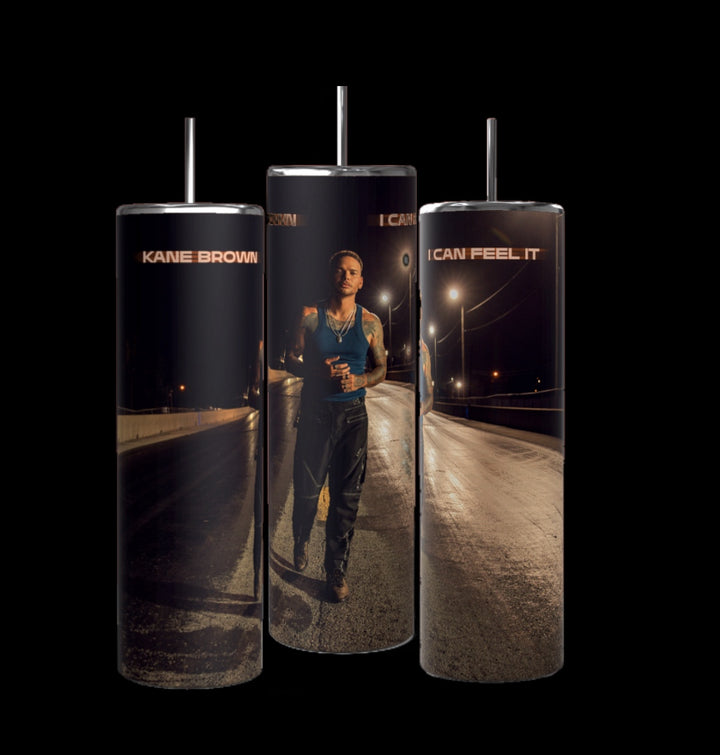 Three Kane Brown Miles On It 20oz Tumblers by Kreative Kreationz display a street scene with a dark-clad figure holding a drink. Featuring "KANE BROWN" and "I CAN FEEL IT" text, they are set against a softly lit luxury kitchen backdrop. Made of high-quality stainless steel, they're stylish and durable.