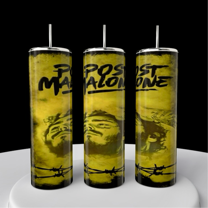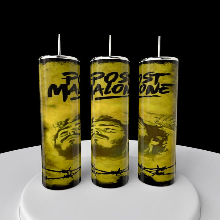 Three Post Malone 20oz tumblers by Kreative Kreationz, with lids and straws, sit on a wooden surface. Each stainless steel, eco-friendly tumbler showcases a yellow and black barbed wire design featuring text "Post Malone" and a partially visible face against a blurred backdrop.
