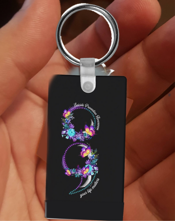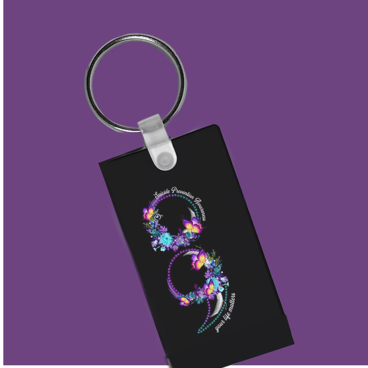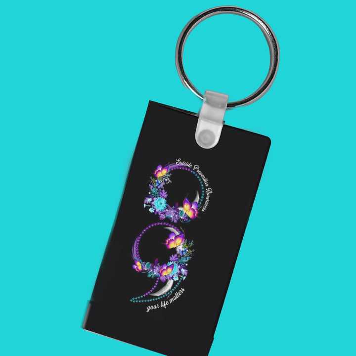 Suicide Prevention Awareness Keychain. This beautifully designed keychain features a sleek semi-colon symbol—a powerful emblem of hope and resilience