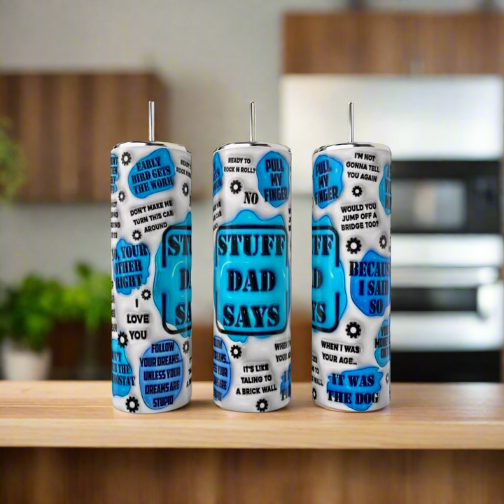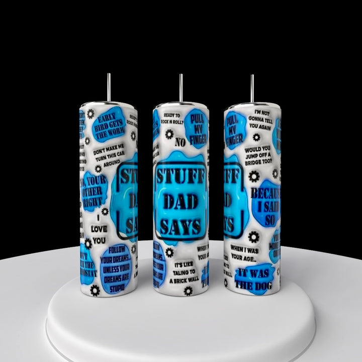 The Kreative Kreationz Stuff Dads Say 20oz Tumbler features funny phrases like "Pull my finger" and "It was the dog" in blue and black on white stainless steel—a perfect, playful gift for dad.