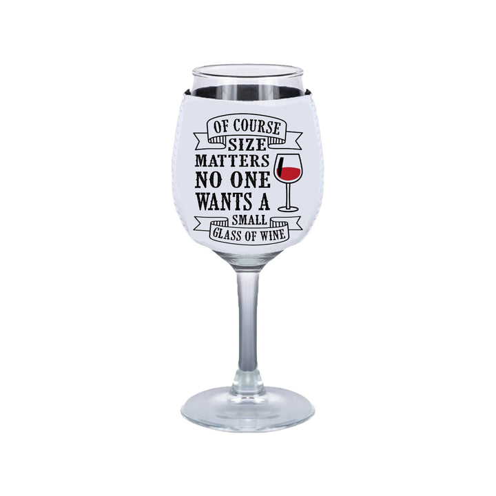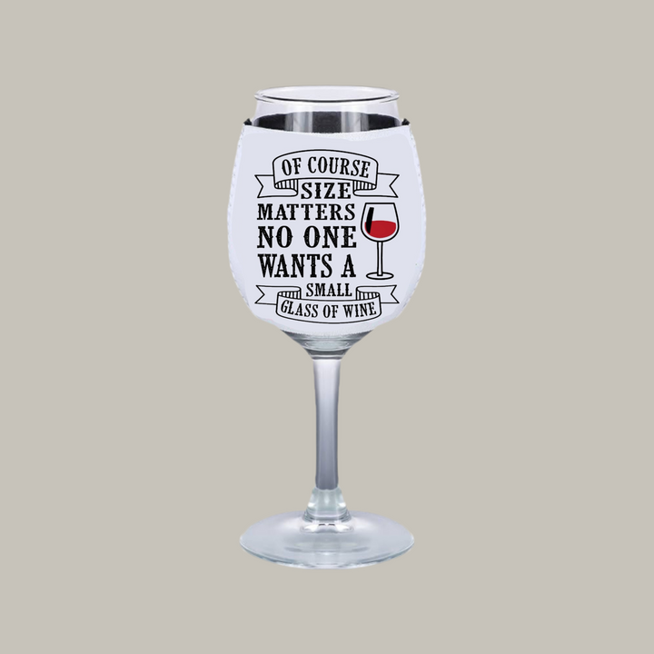 On a kitchen counter, a wine glass displays funny text about size: "Of course size matters, no one wants a small glass of wine." Surrounded by green grapes and set against a blurred kitchen background, it's ideal for true wine lovers who might fancy Kreative Kreationz's insulating neoprene Wine Glass Koozie.