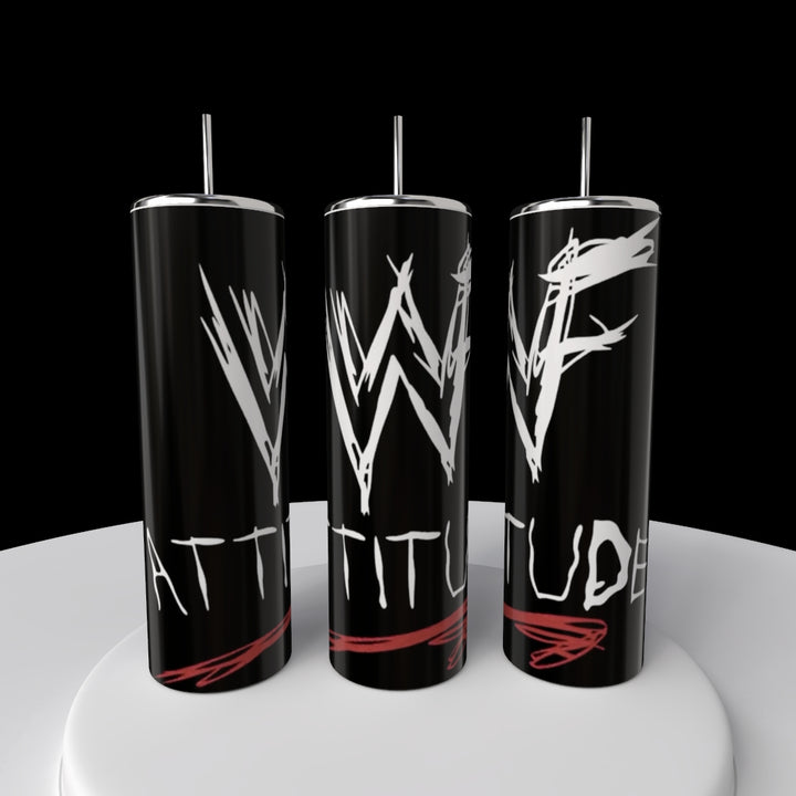 Three black Kreative Kreationz WWF Attitude 20oz Tumblers with silver straws sit on a countertop. Each features "WWF ATTITUDE" in a bold white graffiti-style font with red accents. A blurred kitchen is visible in the background.