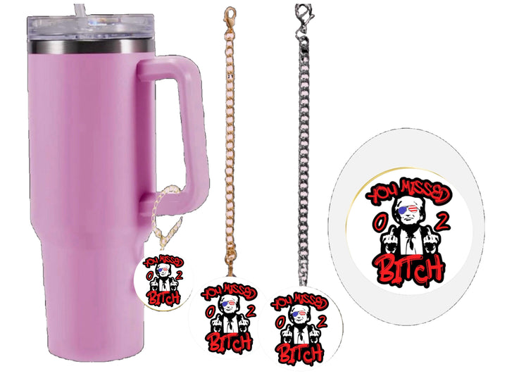 A pink 12cm cup by Kreative Kreationz features a gold chain "You Missed 0 2 Bitch" charm with an illustration, attached to the handle. The text "Cup Charm Silver or Gold" is displayed above. Named "You missed Charm Dangle," it boasts a unique handcrafted design.