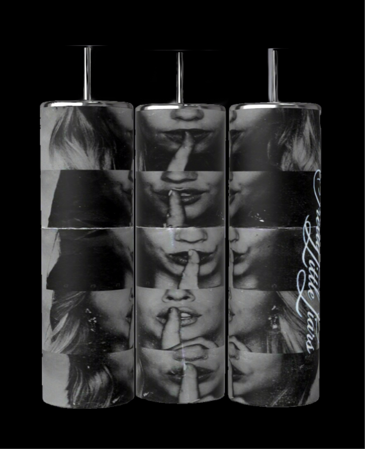 Kreative Kreationz offers a set of Pretty Little Liars 20oz tumblers featuring black and white images of a woman's face making a shushing gesture, with "pretty little liars" printed vertically on one. They include spill-proof lids and an optional reusable straw for convenience.
