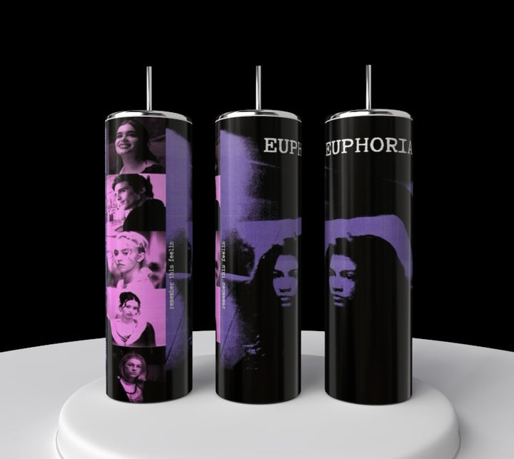 Discover Kreative Kreationz's eco-friendly Euphoria 20oz Tumblers, featuring luxury-inspired designs. The left displays pink-tinted portraits, the middle showcases abstract purple and black art, and the right bears "EUPHORIA" with a partial face image.