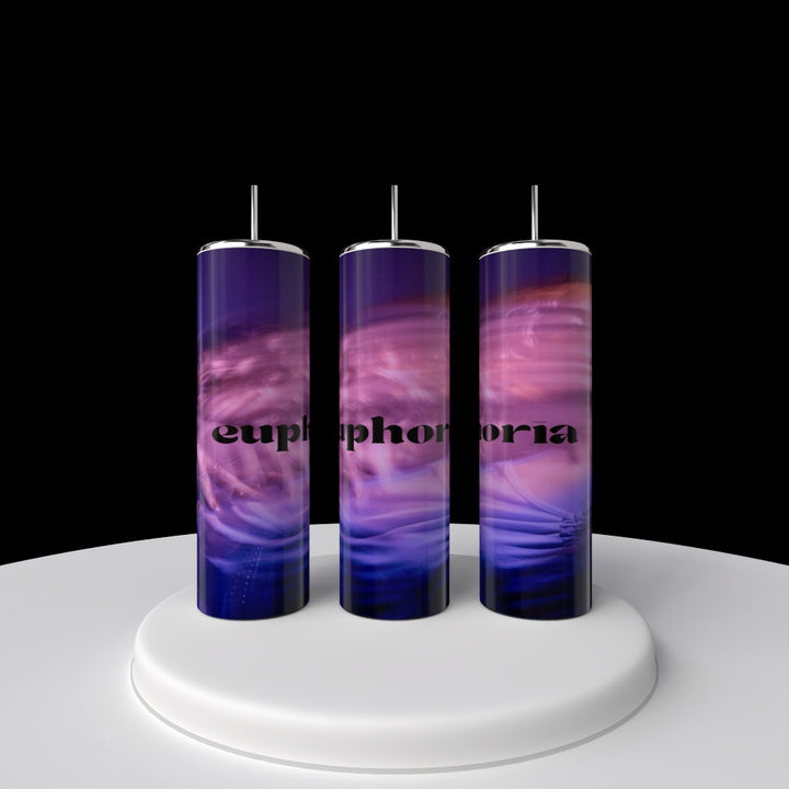 Three Euphoria 20oz Tumblers from Kreative Kreationz stand side by side, featuring a swirling purple and pink design with "euphoria" in bold black letters. Each luxury-inspired stainless steel tumbler includes an eco-friendly metal lid with an upward-extending straw.