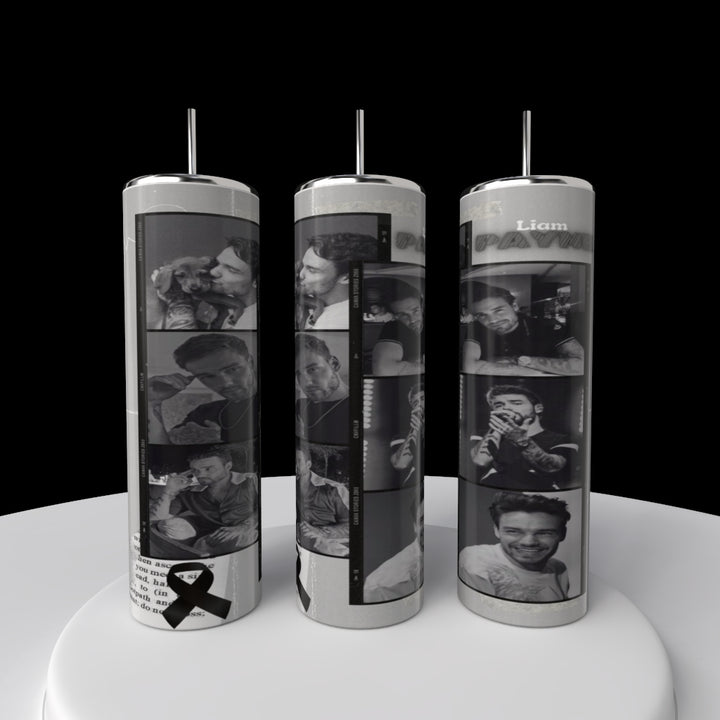 Set of three One Direction 20oz tumblers by Kreative Kreationz, featuring black-and-white collage panels of a smiling man, with one sublimated tumbler accented by a black ribbon and text. Background is a blurred kitchen scene.